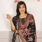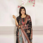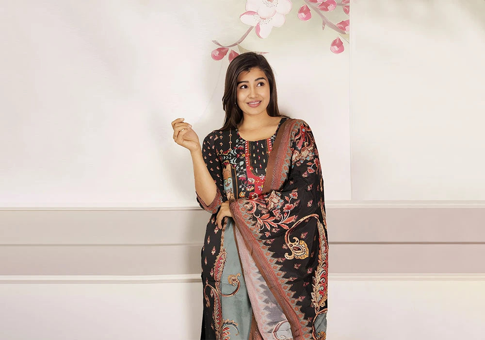 Unveil the elegance of classic charm with our Black Floral Printed Suit Set | Midnight Blossom. Designed to stand out with sophistication, this ensemble blends a rich black base with vibrant multicolor floral patterns and intricate motifs, making it a perfect choice for women who appreciate timeless beauty. The kurta features a square neckline with detailed printed accents, complemented by a harmoniously coordinated dupatta that carries the same regal patterns.