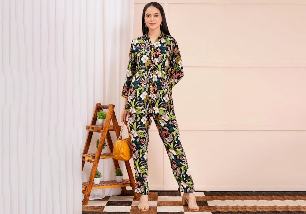 Turn heads in this Black Tropical Floral Print Co-ord Set, a chic blend of comfort and contemporary style. Featuring a collared button-down shirt and matching straight-fit pants, this set is adorned with lush tropical florals in vibrant hues against a sleek black backdrop. Crafted from soft, breathable fabric, it’s perfect for vacations, brunch dates, or casual evenings. The versatile design allows you to wear it as a set for a bold look or mix and match with other wardrobe pieces for endless styling possibilities.