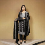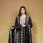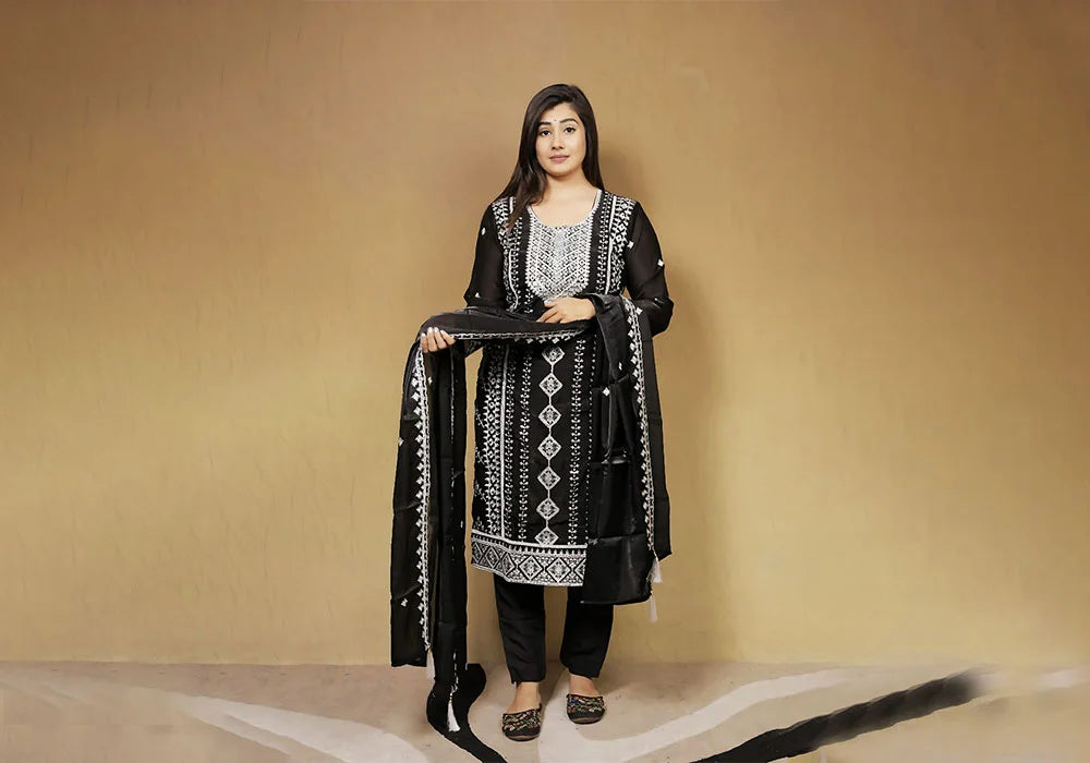 Grace your ethnic wear collection with this stunning Black & White Embroidered Chiffon Suit Set, designed to deliver elegance with comfort. This timeless three-piece ensemble includes: