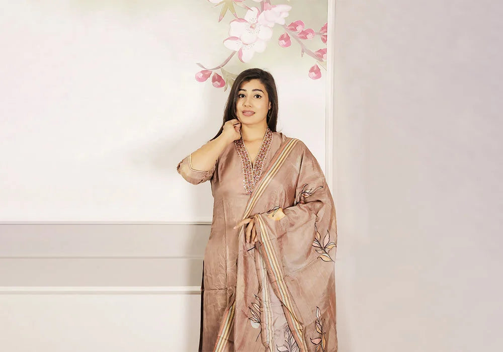 Embrace timeless elegance with our Blush Mocha Elegance Embroidered Luxe Suit Set — a graceful blend of soft sophistication and ethnic artistry. Tailored from a silky-smooth fabric in a muted mocha hue, this ensemble speaks volumes through its intricate embroidered neckline and delicate floral motifs that bring a modern femininity to traditional design. The straight-cut kurta offers a flattering silhouette, enhanced by the fine sheen and comfortable drape of the material.