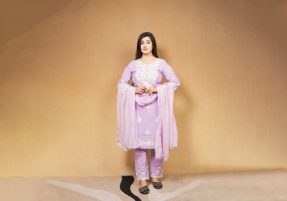 Embrace subtle sophistication with this Delicate Lilac Floral Embroidered Suit Set. The soft lilac hue provides a graceful and feminine touch, beautifully complemented by the intricate white floral embroidery. Crafted for comfort and style, this ensemble is perfect for adding a touch of understated elegance to your everyday wear or for special casual occasions.