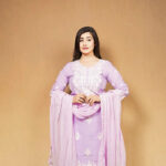 Style this beautiful lilac ethnic suit set with simple jewelry and comfortable flats to create an effortlessly elegant and charming appearance.