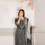 The suit features intricate ethnic prints in a harmonious black-and-white contrast, giving it a regal yet minimalistic appeal. The embellished neckline with delicate embroidery adds a touch of grace, making it suitable for both festive occasions and everyday sophistication. The flowy dupatta, adorned with coordinated prints and an elegant border, enhances the outfit’s grandeur.