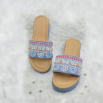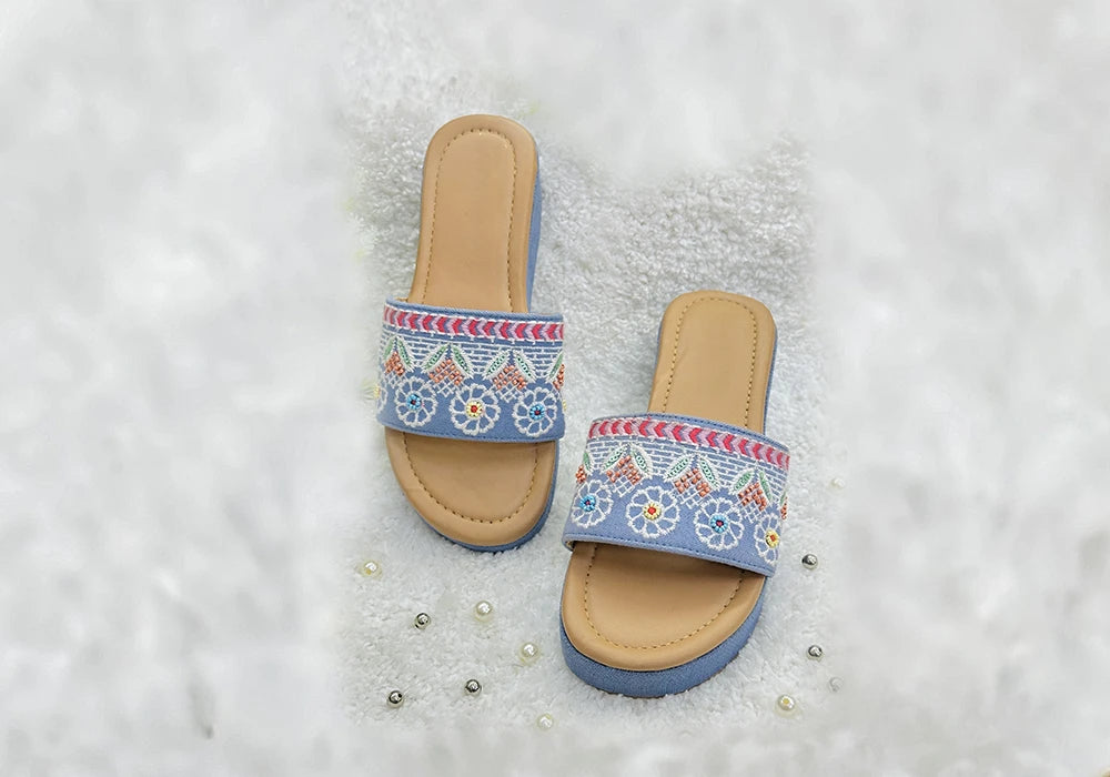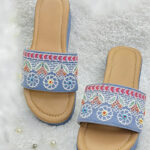 Step into sophisticated style with these elegant blue embroidered mules. The rich blue base is beautifully adorned with intricate embroidery, likely featuring a geometric or abstract pattern that adds a modern and artistic touch. The comfortable slip-on style makes them perfect for everyday wear, while the detailed craftsmanship ensures they stand out. These mules are ideal for adding a refreshing pop of color and elegant flair to your ethnic or contemporary looks, suitable for various events and comfortable for the climate in Uttar Pradesh.