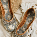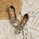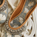 Step into sophisticated charm with these elegant grey embellished mules. The subtle grey base is beautifully adorned with intricate multi-colored embroidery and shimmering embellishments, possibly including beads or sequins, creating a lively and artistic design that stands out. The comfortable slip-on style makes them perfect for everyday wear, while the detailed artistry adds a touch of refined glamour to any outfit. These mules are ideal for adding a subtle sparkle and elegant touch to your ethnic or contemporary looks, suitable for both day and evening events in Uttar Pradesh.