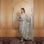 Style this elegant light grey ethnic suit set with delicate jewelry and heels to create a graceful and radiant appearance.
