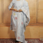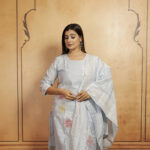 Style this beautiful light grey floral ethnic suit set with simple jewelry and comfortable flats to create an effortlessly elegant and charming appearance.