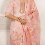 Radiate subtle charm with this Elegant Light Peach Floral Print Suit Set with Embellished Neckline. The soft light peach hue provides a graceful backdrop for the delicate floral motifs printed throughout the fabric. The neckline is beautifully embellished with subtle detailing and small mirrors, adding a touch of refined sparkle. The set includes a matching printed dupatta, completing this effortlessly chic ensemble, perfect for daytime events, casual gatherings, or adding a touch of delicate beauty to your everyday wear.