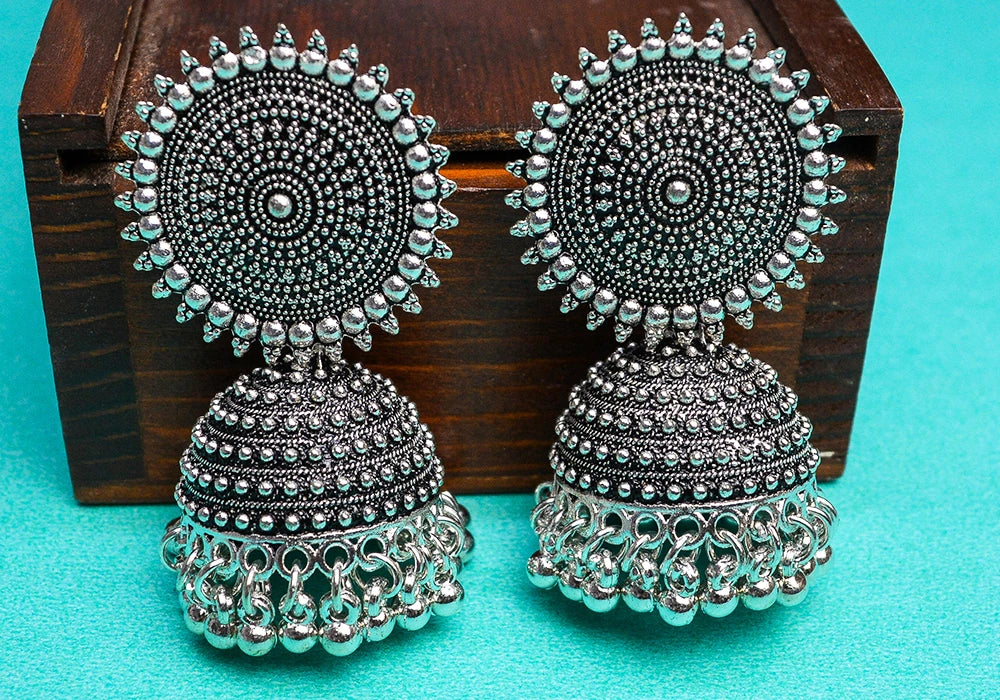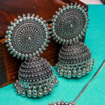 Enhance your ethnic look with these beautifully handcrafted oxidized silver jhumka earrings, paired with a matching maang tikka. Designed with intricate detailing and delicate ghungroo beads, these earrings reflect timeless elegance. The bold circular stud complements the exquisite dome-shaped jhumkas, adding a regal touch to your ensemble. Perfect for weddings, festive occasions, and cultural events, this jewelry set is a must-have for every jewelry lover.