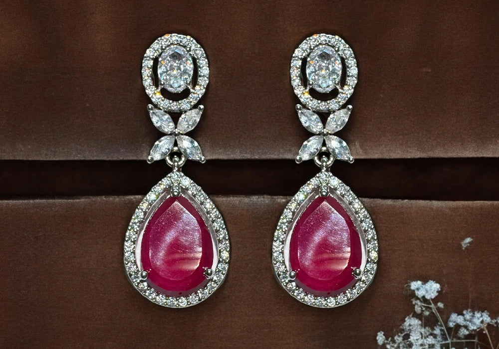 Make an unforgettable impression with these exquisite ruby teardrop dangle earrings, crafted to perfection with a regal aesthetic. Featuring a deep ruby-red teardrop gemstone, each earring is encased in a halo of shimmering cubic zirconia, reflecting light with every movement. The dazzling upper section showcases an oval-cut zircon centerpiece, framed by an elegant arrangement of marquise-cut stones, adding a floral-inspired charm to the design.