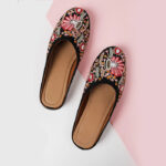 Elevate your ethnic style with the charm of this handcrafted Midnight Bloom Embroidered Jutti. Adorned with intricate floral embroidery in rich hues of red, pink, and gold, this jutti is a true reflection of artisanal finesse. Set against a bold black base, the vibrant threadwork creates a stunning contrast, making it a perfect match for festive wear, weddings, or even elegant casual outings.