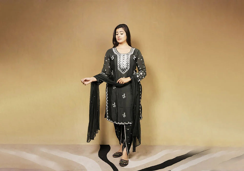 Step into timeless elegance with our Midnight Mirror Magic Embroidered Suit Set, a stunning ensemble designed to exude grace and sophistication. Crafted in a rich black hue, this suit set is adorned with intricate mirror work and thread embroidery that lends a radiant glow to its traditional aesthetic. The kurta features a square neckline richly bordered with mirror embellishments, adding an opulent touch to the otherwise minimalist design.