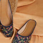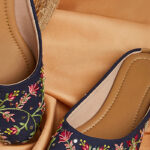 Ideal for weddings, poojas, and cultural gatherings, this jutti blends traditional artistry with contemporary appeal. The deep navy tone provides a sophisticated base, making the vibrant embroidery pop effortlessly while maintaining an air of subtlety and grace.