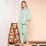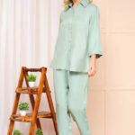 Refresh your wardrobe with this Pastel Green Solid Co-ord Set, the perfect combination of elegance and comfort. Featuring a collared button-down shirt-style kurta with relaxed 3/4th sleeves and matching straight-fit trousers, this set exudes effortless sophistication. The soothing pastel green tone adds a touch of freshness, while the lightweight fabric ensures breathability and comfort all day long. Perfect for office wear, casual brunches, or semi-formal occasions, this co-ord set is a must-have for the modern woman’s collection.