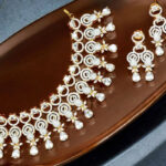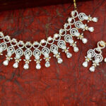 The graceful teardrop-shaped stones at the bottom create a mesmerizing effect, capturing the light from every angle. Paired with matching statement earrings, this set is a symbol of royal elegance—perfect for brides, receptions, gala nights, and grand festivities. Whether styled with a traditional lehenga, a designer saree, or an embellished gown, this necklace set is a testament to timeless luxury and sophistication.