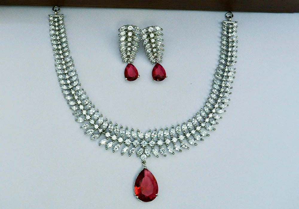 Drape yourself in pure luxury with this Regal Ruby Drop Diamond Necklace Set, a masterpiece of brilliance and sophistication. The necklace showcases a glittering array of high-grade cubic zirconia stones, arranged in a mesmerizing pattern that radiates grace and elegance. The highlight of this design is the bold ruby-red teardrop pendant, symbolizing passion, power, and timeless beauty.