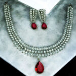 This captivating necklace is paired with matching earrings, featuring delicate crystal embellishments and striking ruby-red teardrop stones. Designed to exude royalty, this set is perfect for brides, evening galas, formal gatherings, and grand celebrations. Its silver-plated finish complements both traditional and contemporary attire, making it a versatile statement piece.
