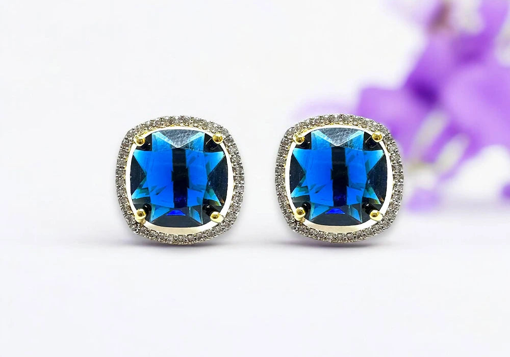 Encased in a halo of shimmering cubic zirconia, these earrings achieve the perfect balance of classic elegance and modern charm. The gold-plated prongs secure the gemstone, adding a subtle contrast that enhances the rich hue of the sapphire. Designed for both special occasions and everyday luxury, these earrings effortlessly elevate any ensemble, from ethnic wear to contemporary evening gowns.