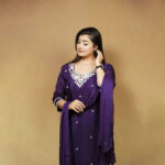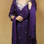 Make a statement with this Royal Purple Embellished Ethnic Suit Set featuring intricate white embroidery around the neckline and scattered floral motifs throughout. The luxurious georgette fabric flows effortlessly, while the semi-stitched design ensures a flattering fit. Perfect for weddings, festive occasions, or evening gatherings, this ensemble comes with a matching dupatta and churidar for a complete ethnic look.