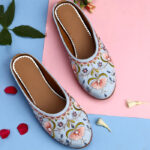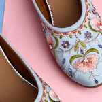 Step into elegance with the Serene Bloom Embroidered Pastel Jutti, a perfect harmony of delicate design and timeless comfort. This pastel blue beauty features finely embroidered floral patterns in soft pinks, olive greens, and hints of coral—each thread meticulously hand-stitched by skilled artisans.