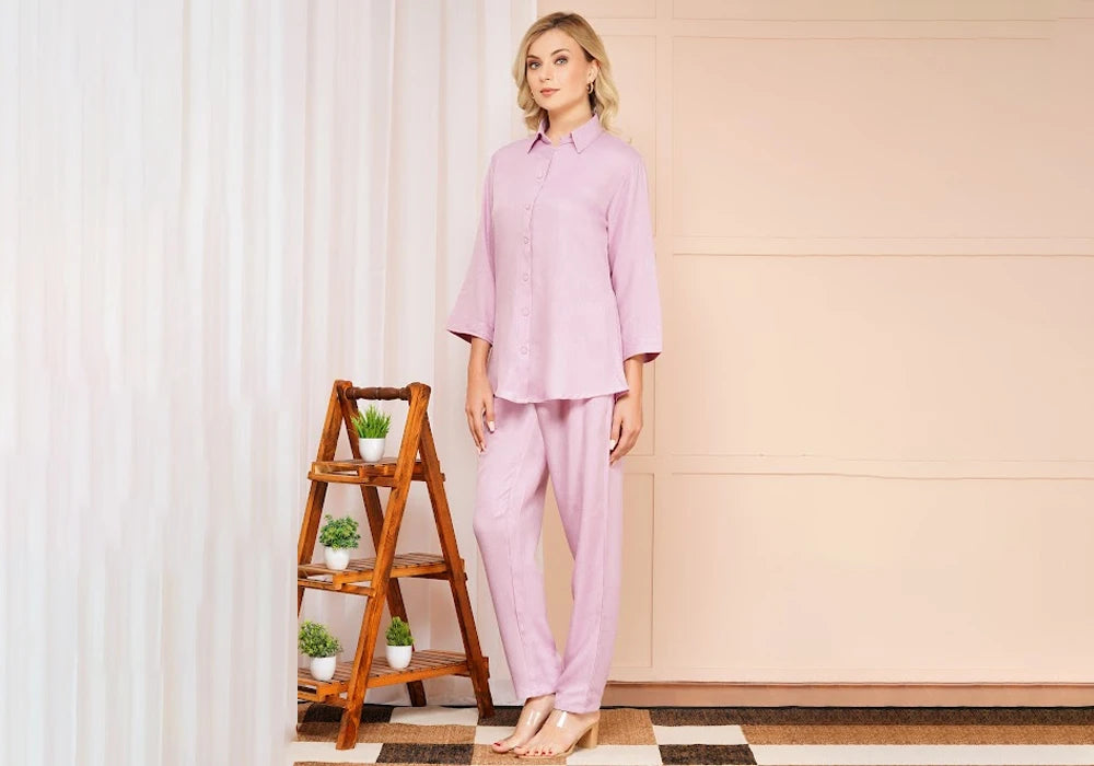 Pair this lavender co-ord set with pearl studs, nude block heels, and a chic handbag for a graceful and polished look.