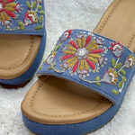 Add a touch of timeless grace and artistic detail to your step with these beautiful blue mules!