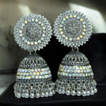 Step into a world of regal charm with these exquisite oxidized silver jhumka earrings, designed to add a touch of timeless elegance to your ensemble. The intricately carved sunburst pattern on the stud symbolizes radiance and power, making these earrings a perfect statement piece. Adorned with shimmering iridescent stones, the detailed metal craftsmanship reflects a perfect blend of heritage and modern aesthetics.