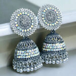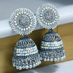 The dome-shaped jhumka is embellished with dazzling crystal accents, offering a captivating shimmer with every movement. Finished with delicate silver ghungroo-style beads, these earrings create a soft, graceful sound, enhancing their traditional appeal. Ideal for weddings, festive occasions, or cultural celebrations, these jhumkas pair beautifully with sarees, lehengas, and Indo-Western attire.